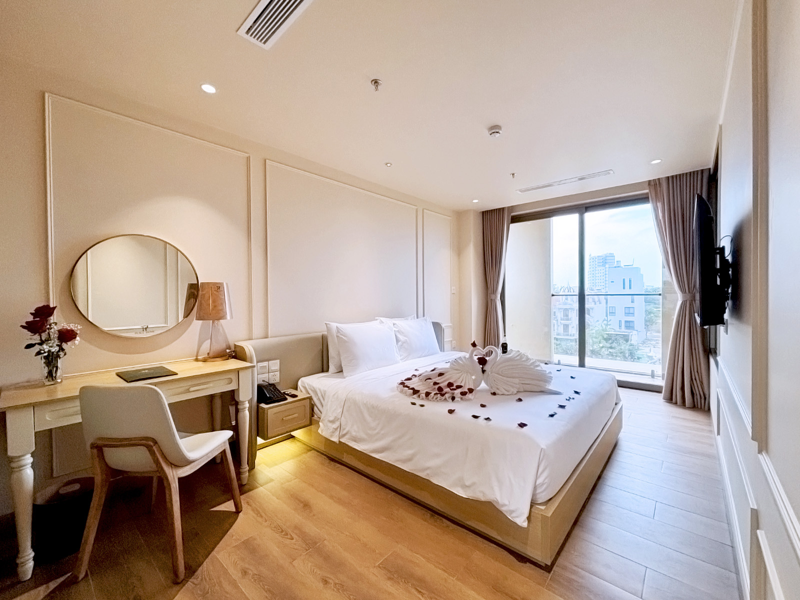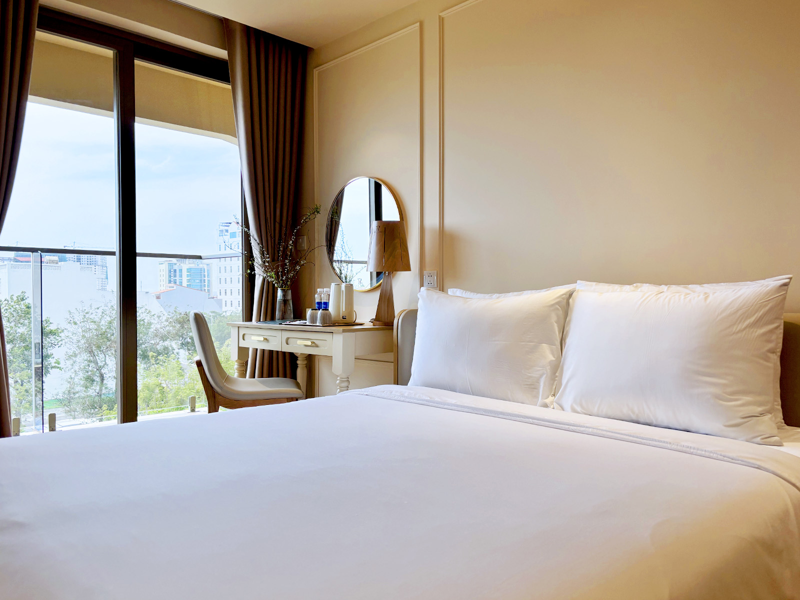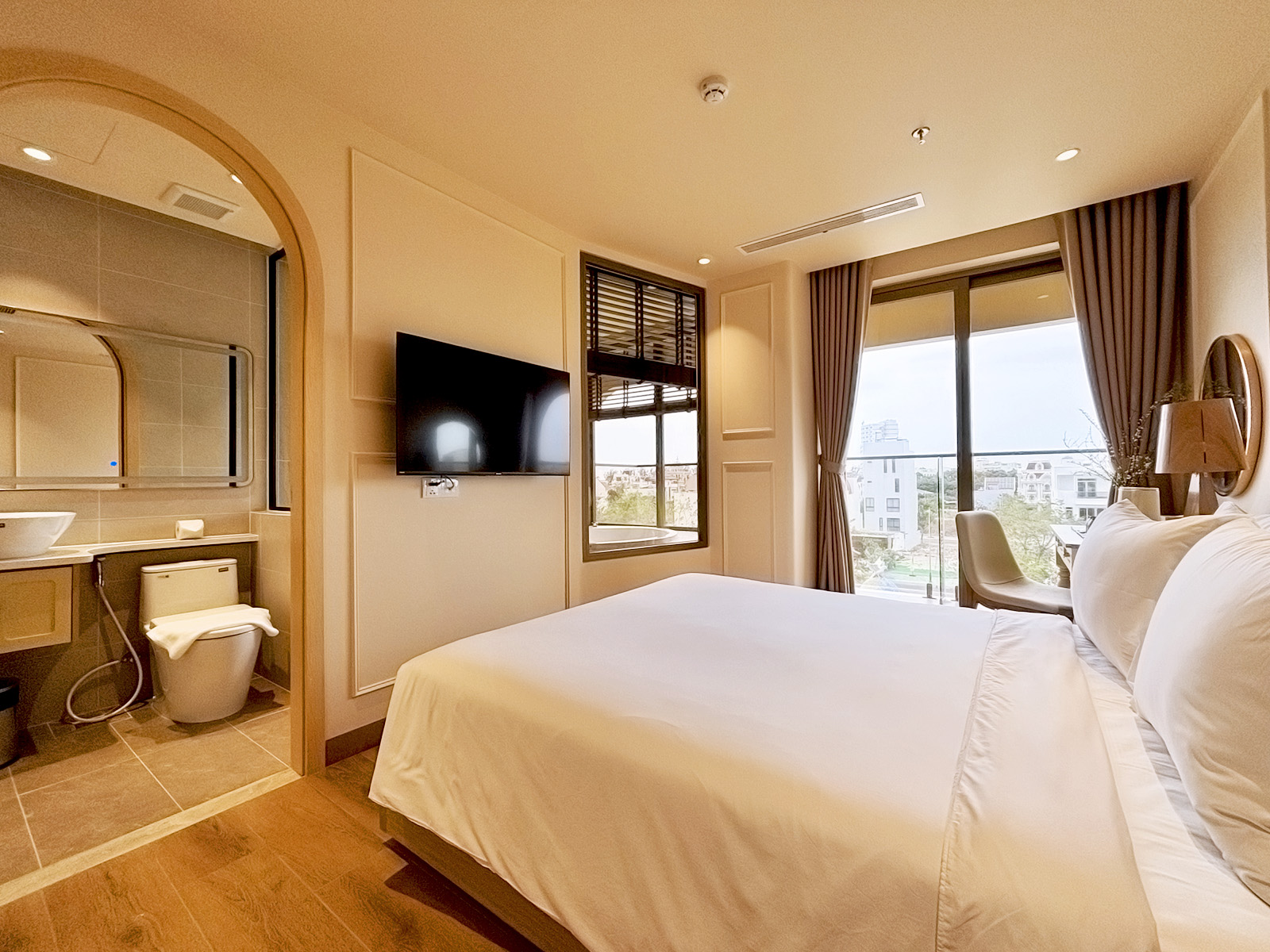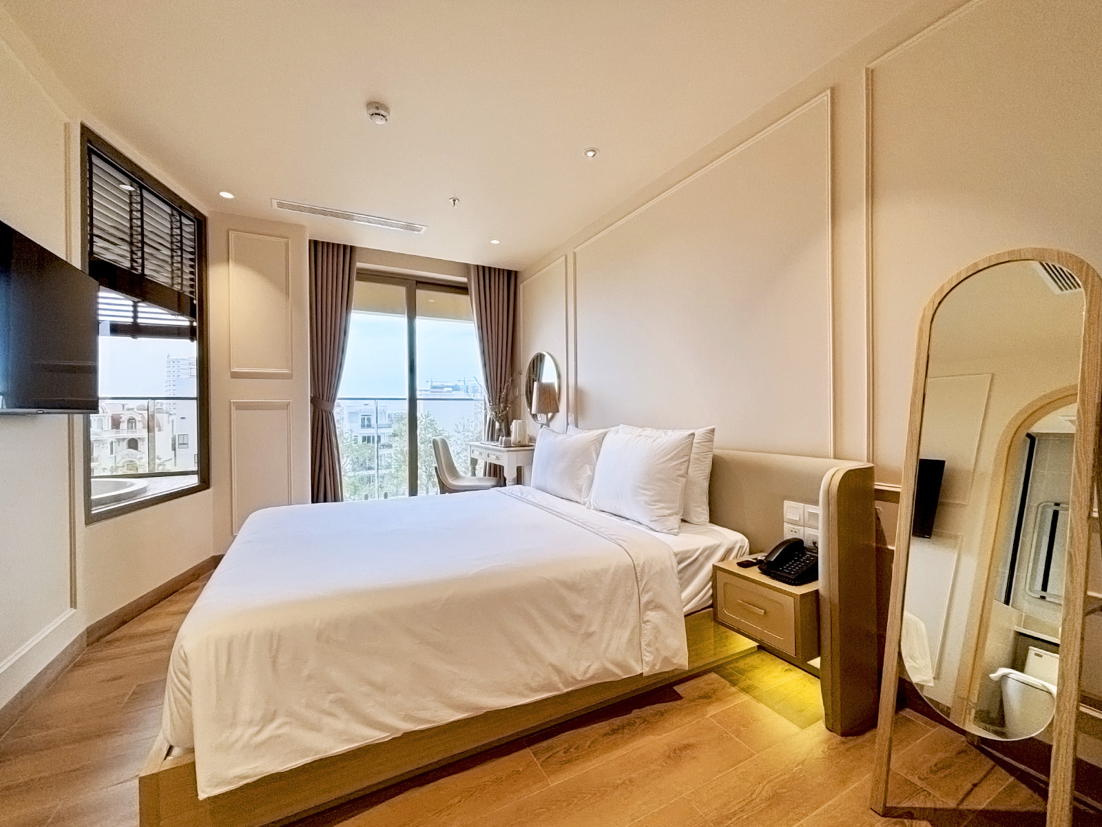 Cửa sổ lớn hướng ra công viên mang lại ánh sáng tự nhiên và không khí trong lành, giúp không gian phòng luôn tươi mới, thư giãn suốt cả ngày.